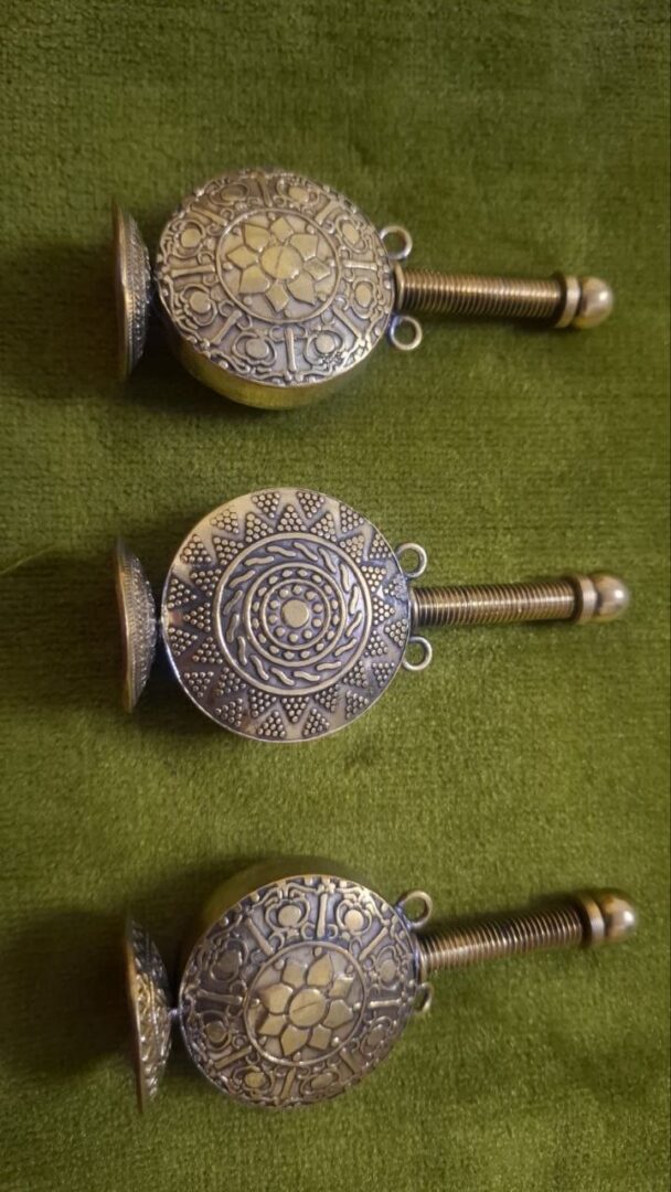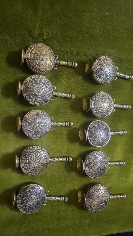 This is an ornate brass-alloy metal kohl container with a built-in applicator stick. Fill it up with ithmid kohl and then use the applicator to apply it at your convenience. There are many different designs, contact us if you want to make a special request for a specific design.